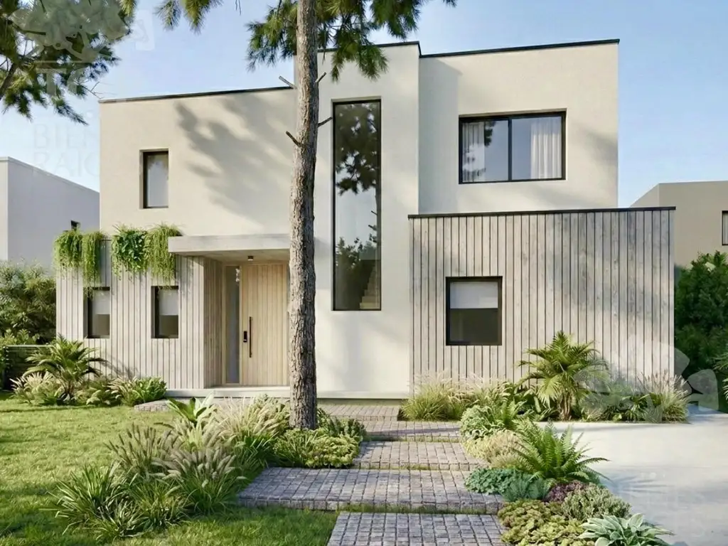 EQUIPAMIENTO Y TERMINACIONESCalefacción por piso radiante caldera dual marca Baxi, preinstalación de AA en todos los ambientes, pisos de porcelanato símil madera Rostock de gran formato en toda la casa, salvo baños (Porcelanato ILVA) y sector servicio (Porcelanato Alberdi). Griferías FV, y Roca, mesadas de cuarzo blanco Purastone/Silestone o similar. Carpinterías exteriores de Aluminio negro A30 y Módena con doble vidrio hermético. Puertas interiores con tablero liso altura 2.20, puerta principal de madera maciza en Kiri con vidrio de seguridad en visor lateral, cerradura biométrica. Frentes de placard melamina blanca de Egger, interiores de placard y vestidor en blanco. Amoblamiento de cocina con frentes en Gris y Madera, cajones con guías telescópicas y bisagras cierre suave. Bacha Johnson Luxor, horno eléctrico y anafe a gas. Revestimiento exterior de polímeros plásticos terminación intermedia, frente en PB revestido con siding vertical en ambos laterales. Pileta de natación revestida, con filtro y bomba. Accesos peatonales en pórfido y vehiculares en hormigón peinado. Pérgola lateral en madera tratada para exterior. Sector galería con cubierta de chapa prepintada blanca, cielorraso de enlistonado de madera sin nudos.