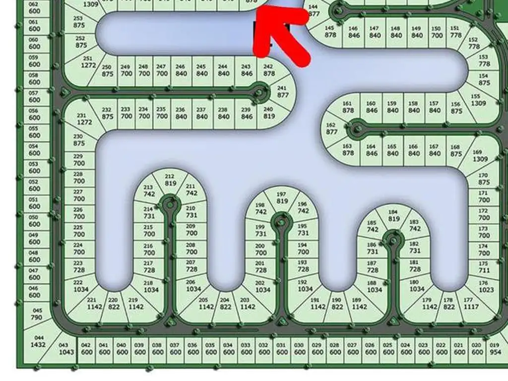 Cuenta con 406 lotes, muchos de ellos con vistas a la laguna central.