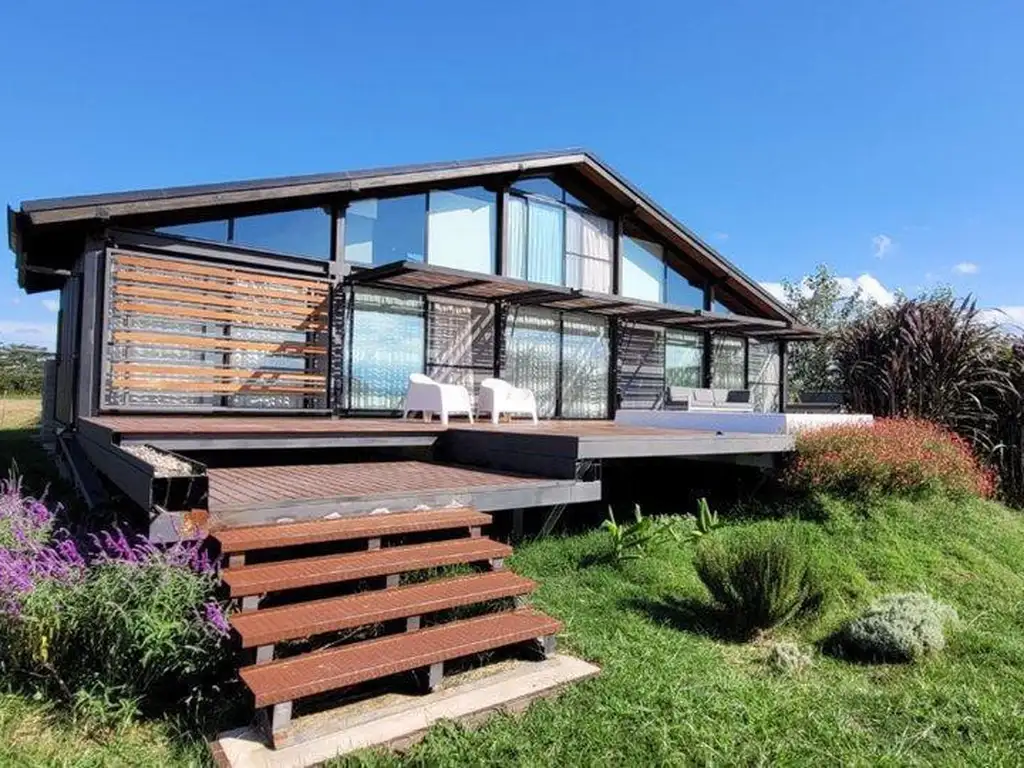 Implantada sobre un lote de 1.000 m2, la vivienda se sitúa estratégicamente hacia el sector sur del terreno. Cuenta con 110 m2 cubiertos, cochera cubierta para dos vehículos, depósito, deck de 82 m2 orientado al noreste y mini piscina con aireadores e iluminación LED RGB.