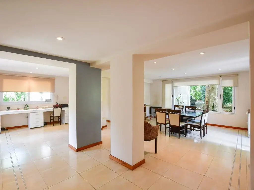 Amplio living comedor con ventanales al jardín.