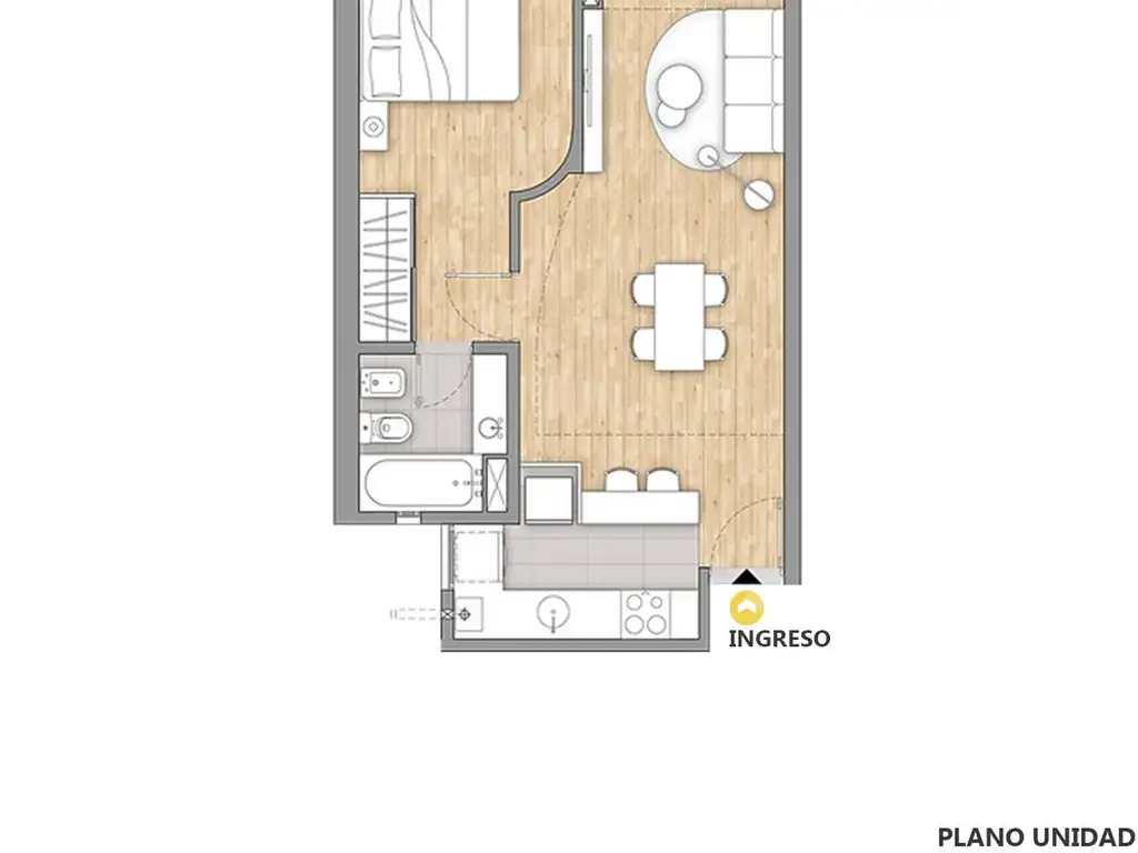 Unidad con ingreso a estar comedor y cocina integrada con muebles bajo mesada y alacena. Dormitorio con placard y salida a balcón. Baño completo con terminaciones de calidad. Preinstalación para aire acondicionado en estar y dormitorio, aberturas de aluminio con oscurecimiento y excelente distribución de planta pensada para ventilación e iluminación natural.