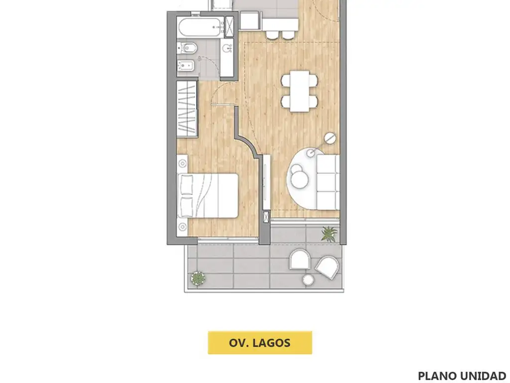 Unidad con ingreso a estar comedor y cocina integrada con muebles bajo mesada y alacena. Dormitorio con placard y salida a balcón. Baño completo con terminaciones de calidad. Preinstalación para aire acondicionado en estar y dormitorio, aberturas de aluminio con oscurecimiento y excelente distribución de planta pensada para ventilación e iluminación natural.
