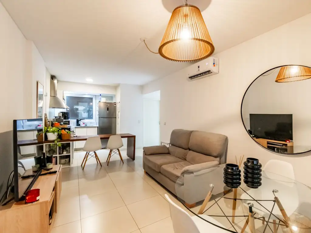 El departamento se encuentra en 1er piso al frente con un amplio balcón corrido. Se ingresa a una recepción que da acceso a la cocina comedor con barra. Luego tenemos el living con vista al balcón. Cerca del ingreso al departamento nos encontramos con un baño completo de uso social y luego los 2 dormitorios, el principal con baño en suite y vestidor. Posee losa radiante.