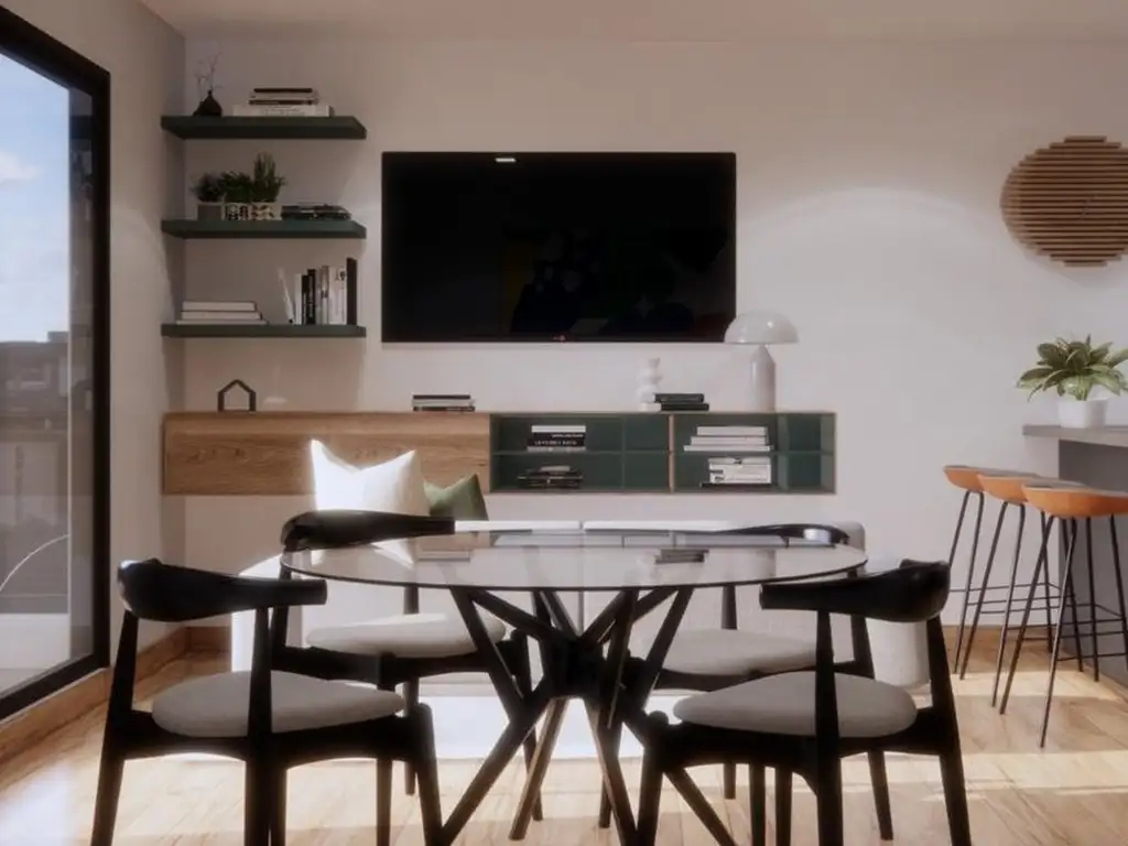 - Living comedor con cocina integrada (Alacenas, Bajo mesada y Barra)