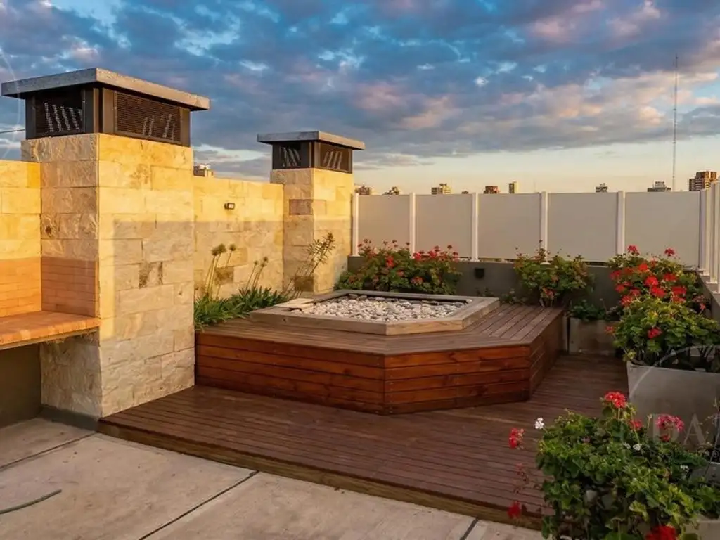 La unidad cuenta con un amplio comedor, una cocina con comedor diario, un dormitorio en suite con vestidor, un baño completo y un toilette. Además, dispone de una terraza propia equipada con pileta, parrilla y solarium, ideal para disfrutar de momentos al aire libre. El edificio también ofrece una terraza de uso común con parrilla y solarium, así como un laundry.