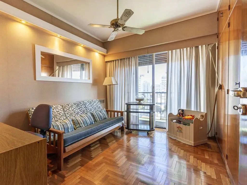 El departamento cuenta con 3 habitaciones muy cómodas y luminosas (2 de ellas con balcón), todas con pisos de madera, placards empotrados con puertas de madera y ventanales con persianas.
