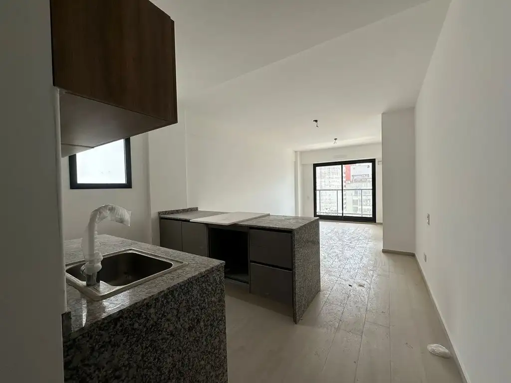 Living comedor con cocina integrada y salida a balcón al contrafrente.