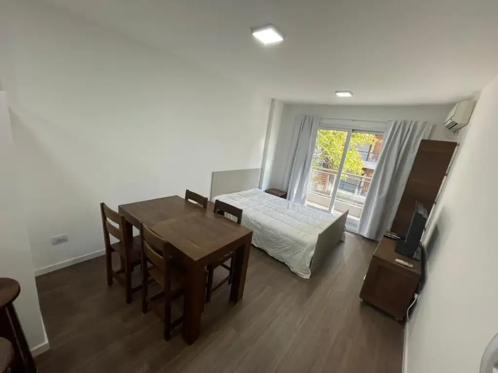Ingreso al departamento por ambiente único que cuenta con cocina completa, heladera, banquetas, mesa y sillas, cama, tele, mueble rack de guardado, aire acondicionado. El edificio cuenta con pileta, quincho y parrillero.