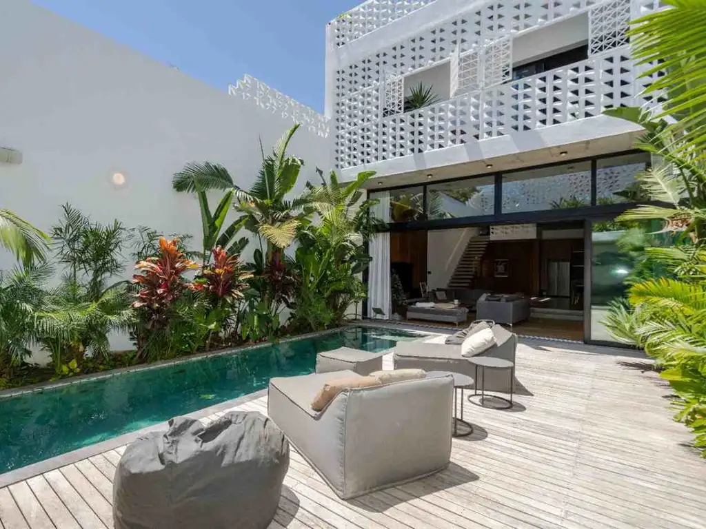 El área social se desarrolla en desnivel, con un living comedor de generosas dimensiones y ventanales de piso a techo que integran el interior con el exterior, creando una conexión directa con el jardín subtropical y la piscina climatizada estilo Bali, revestida con piedras BALÍ y calefaccionada por caldera a gas. La luz natural, el verde y la amplitud son protagonistas en cada ambiente.