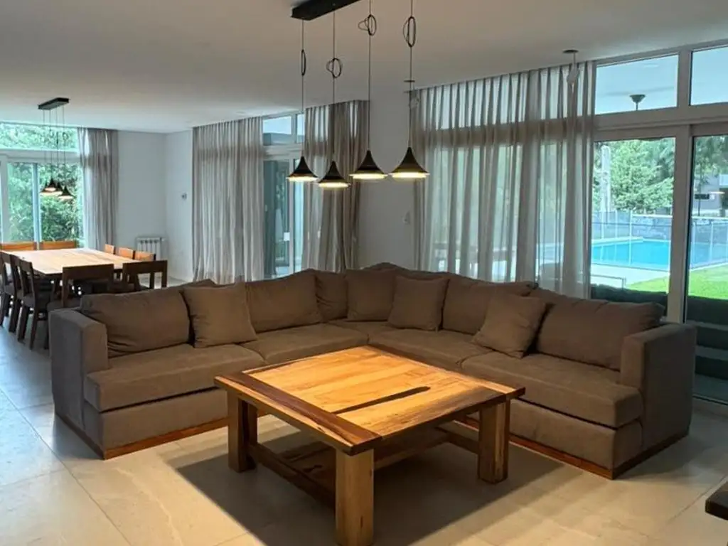El exterior cuenta con jardín parquizado, piscina y sistema de riego por aspersión, pensado para un fácil mantenimiento.