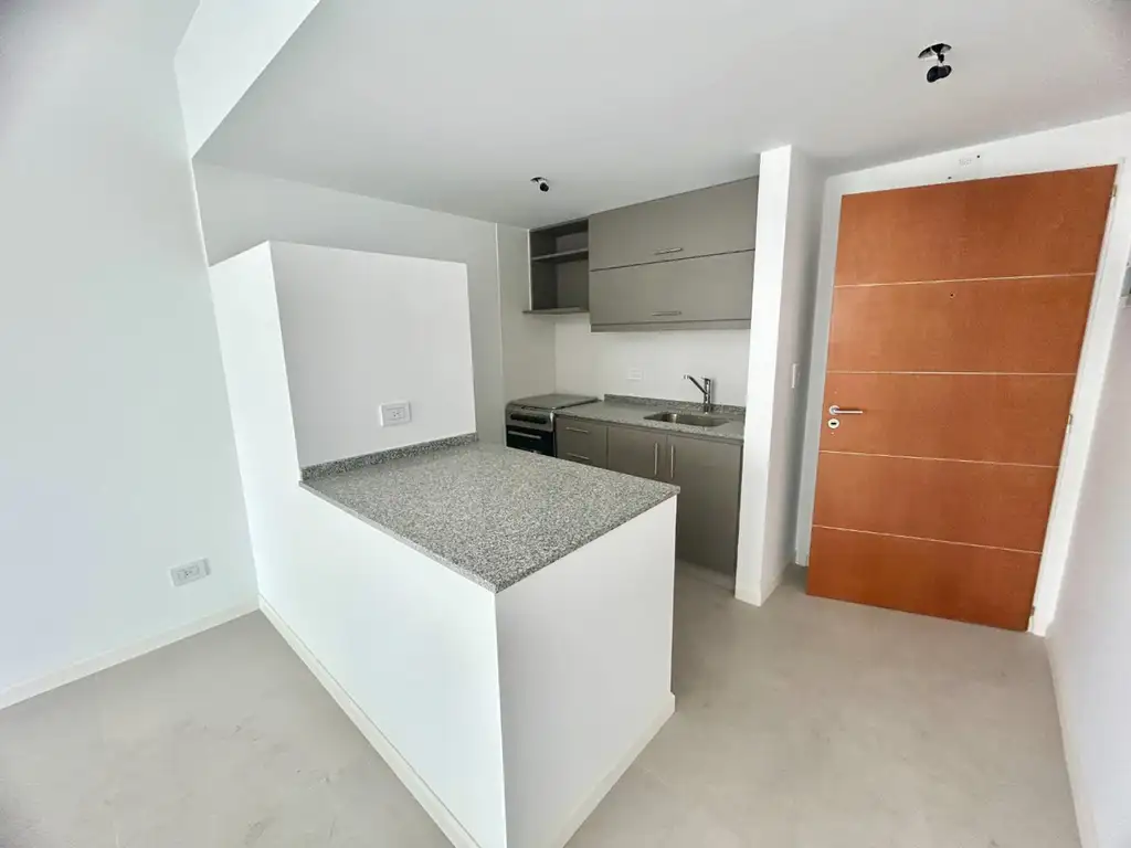 Cuenta con una cocina integrada, con alacenas y muebles bajo mesada, cocina. Barra desayunadora, con mesada de marmol, lo que genera una separación en el ambiente. Gran ventanal con balcón, que ofrece luminosidad, ventilación y una excelente vista abierta.