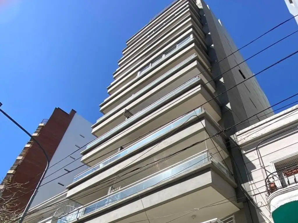 Edificio de 14 pisos. 4 departamentos por piso. 1 ascensor. Muy luminoso. Ambiente con placard y espacio de guardado. Cocina integrada. Agua caliente por termotanque eléctrico. Pisos de porcelanato en todo el ambiente. Baño completo. Balcón aterrazado. Amenities: parrilla, SUM, jacuzzi, laundry. Terraza de uso común.