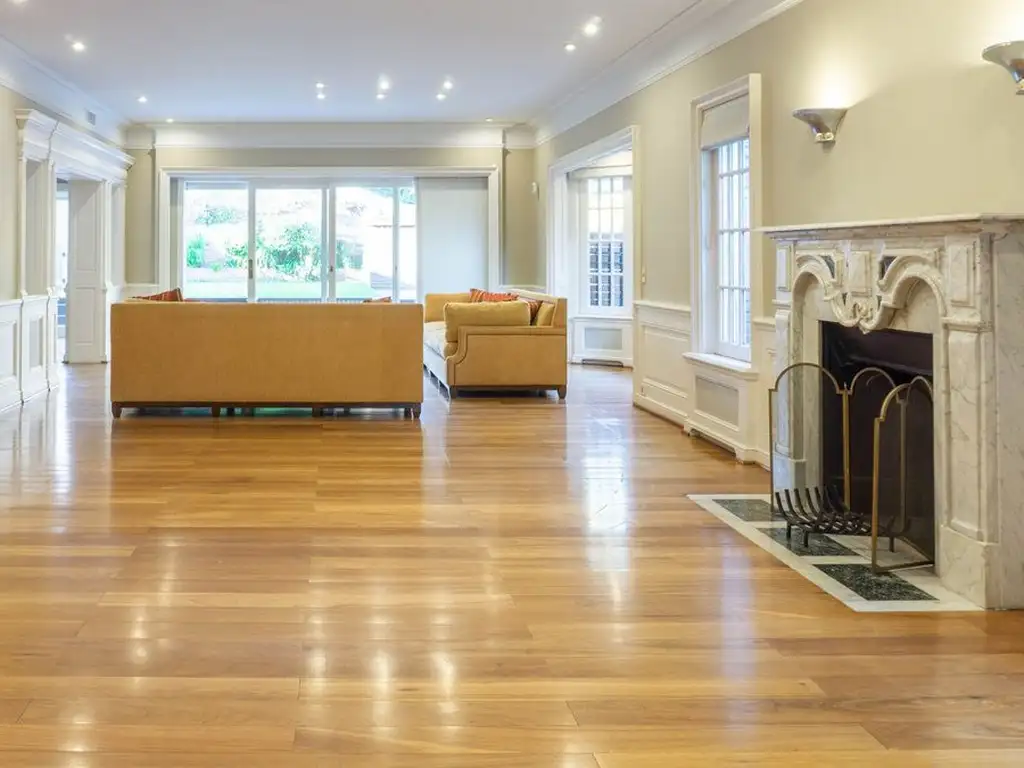 El estar principal con hogar de mármol estilo francés y el comedor formal se integran visual y funcionalmente al exterior a través de grandes ventanales que conectan con la galería cubierta, el jardín parquizado y la piscina.