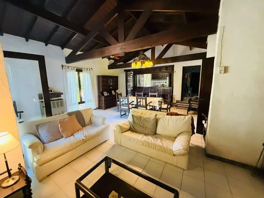 La vivienda presenta una distribución funcional con 3 dormitorios amplios, 2 baños completos, living comedor con hogar a leña y cocina integrada por barra. Cuenta con cochera cubierta, terraza contigua al living y zona de parrilla.