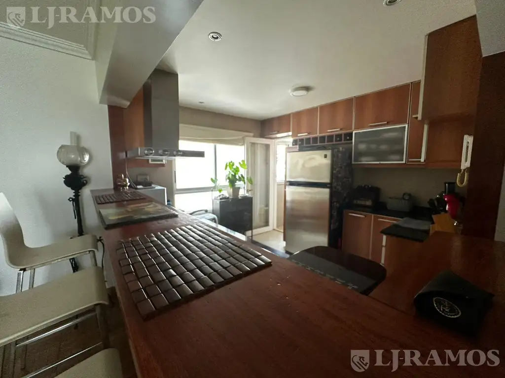 El acceso es mediante un palier semi privado, y la entrada principal se realiza a través de una puerta blindada que conduce al amplio living comedor. La cocina, de generosas dimensiones, está completamente equipada con alacenas y muebles bajo mesada de alta calidad, diseñados a medida. Cuenta con espacio para una heladera doble y un lavavajillas de hasta 9 cubiertos. La cocina es a gas natural e integrada con una barra alta para desayunar. Un lavadero independiente con ventilación y caldera para losa radiante individual complementa las instalaciones.