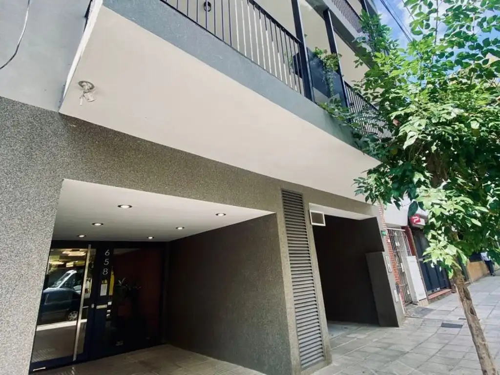 Edificio de 9 pisos. 4 departamentos por piso. 2 ascensores. Muy luminoso. Ambiente con cocina integrada. Agua caliente central. Pisos de porcelanato en todo el ambiente. Calefaccion por split frio/calor. Baño completo. Balcón. Amenities: terraza con parrilla, piscina, solarium, laundry.