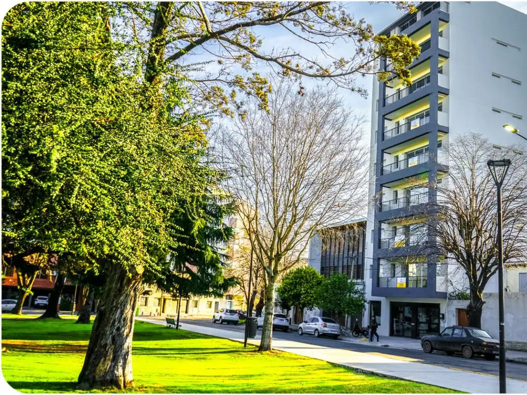 Departamentos de 6 años de antiguedad sobre plaza Sarmiento, 1 dormitorio con placard e interiores realizados ubicado en piso 3o contrafrente de excelente calidad de 49 m2 sin balcón. Cocina integrada al living comedor mediante barra desayunadora, espacio para lava ropas, baño completo con ventilación natural, calefacción por radiadores con caldera dual.