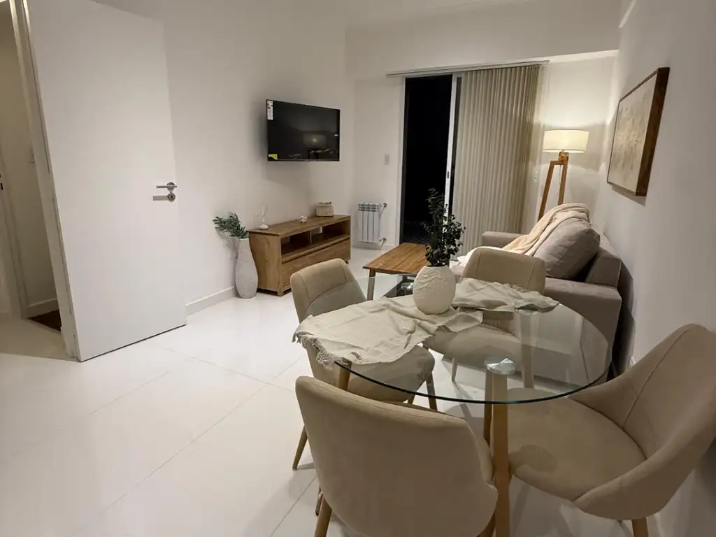 Al ingresar mediante hall de distribución, accedemos al amplio y cómodo living comedor con balcón salida a patio. TV de 43”. Sillón, mesa ratona, mueble para TV, mesa con 4 sillas, lámpara de pie, mueble de apoyo, cortinas Hunter Douglas. En el patio muebles de exterior