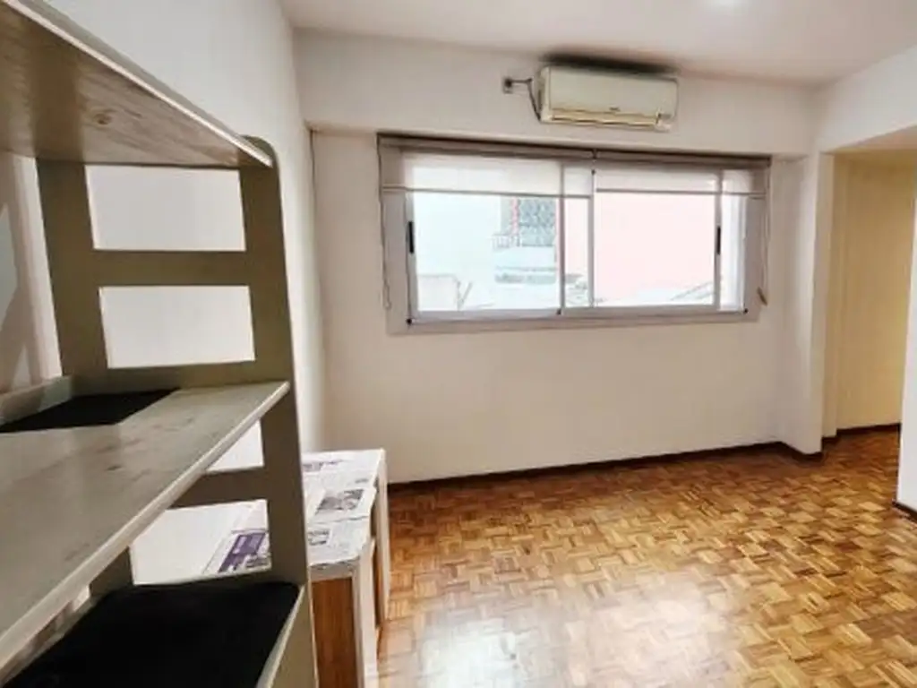 Living comedor con ventanas al contrafrente, aire acondicionado. Pequeño pasillo que conduce al baño completo con bañera y ventilación propia y a la izquierda encontramos la habitación con ventana al pulmón, con mosquitero, ventilador de techo y placard nuevo con organizador.