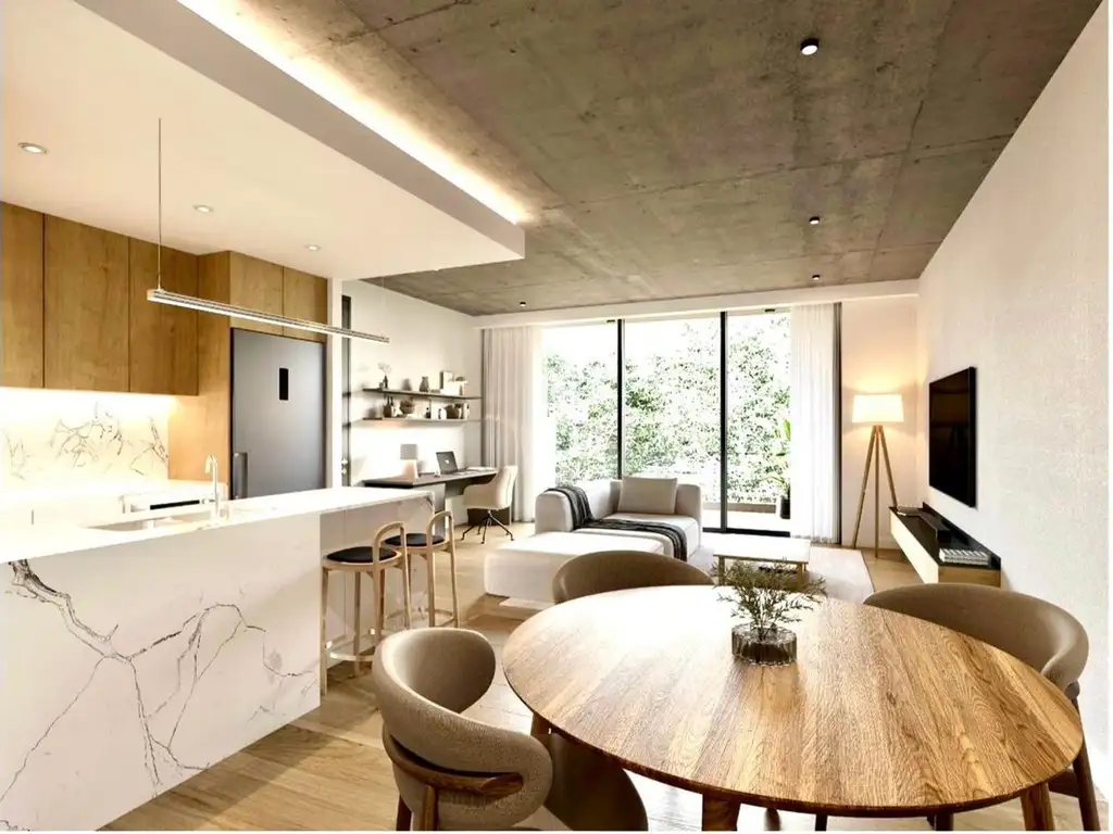 Amplio Living Comedor de 8,44m x 5,30m con amplios ventanales de PVC con DVH (Doble Vidrio Hermético) que salen al Balcón Terraza de 22m2 con Parrila Propia. Piso de Porcelanato simil madera con Losa Radiante regulable por ambiente. Toillete de Recepción.
