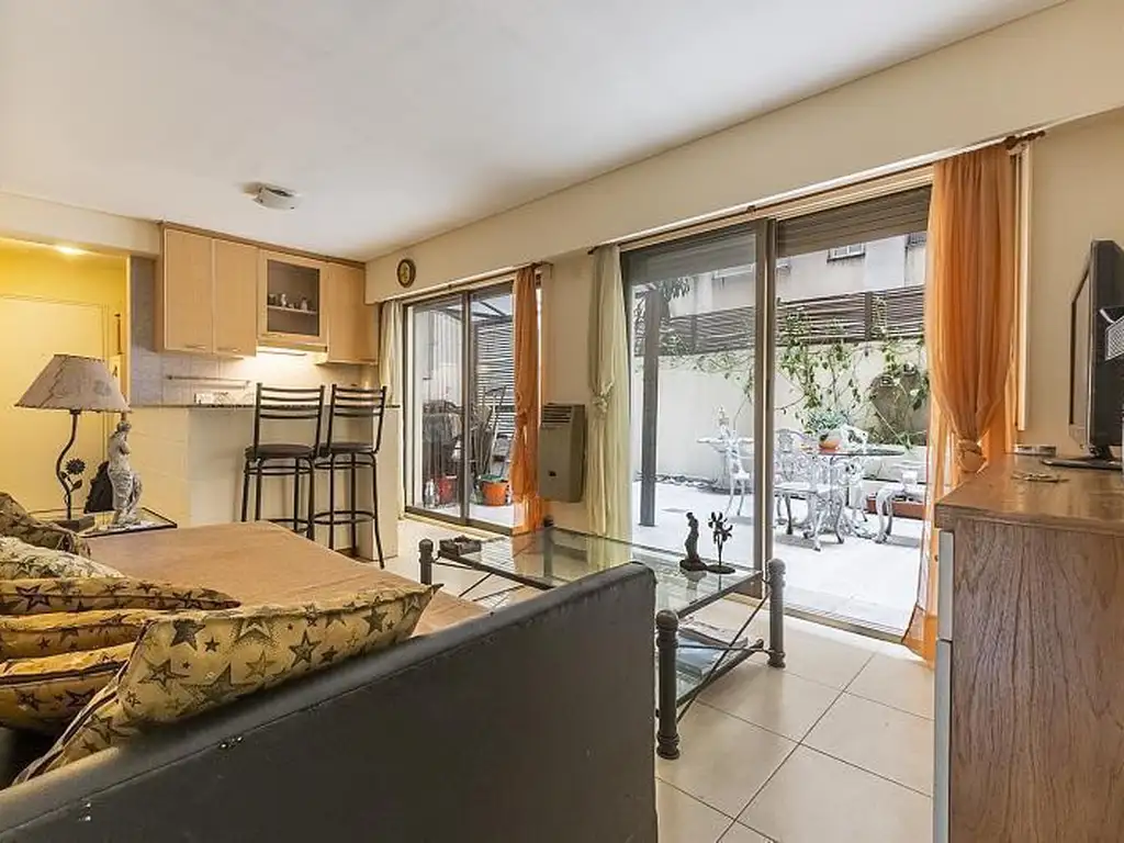 Living-comedor con cocina integrada y salida a patio privado