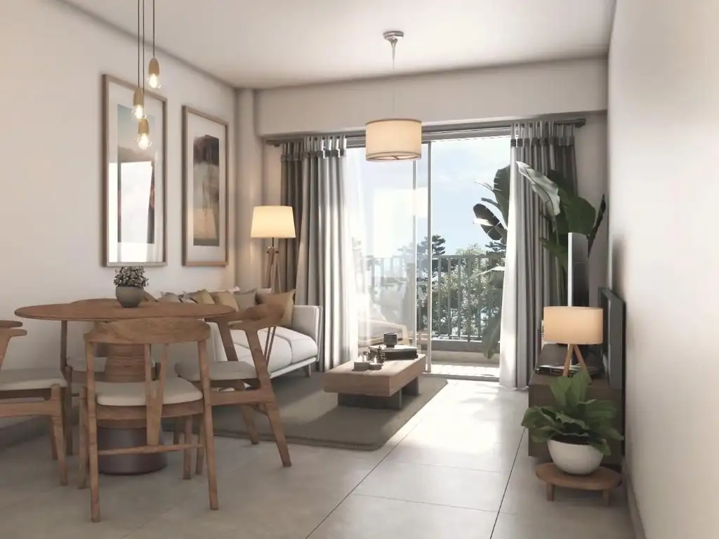 Descripción de las unidades de 1 amb:Se ingresa por cocina integrada al ambiente con muebles bajo mesada y alacena, mesada de granito gris mara (o similar) con bacha de acero inoxidable y grifería monocomando. Salida a balcón. Baño completo. Unidad eléctrica.