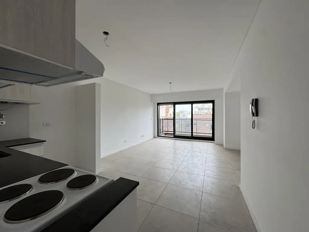 Departamento: A estrenar de superficie cubierta de 35 m2 y 4 m2 de balcón al frente. Pisos de porcelanato. Amoblamiento completo de cocina de melamina, con cocina, anafe eléctrico marca Philco y extractor colocado. NO POSEE GAS el edificio. Bacha marca Johnson y monocomando marca FV. También preinstalación para el lavarropa. Aberturas DVH de aluminio. Termotanque Philco. Los sanitarios marca Ferrum. Persianas electricas.