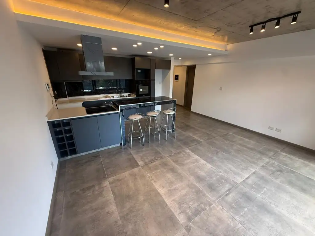 Al ingresar, se desarrolla un amplio ambiente principal con cocina integrada, equipada con barra desayunador que delimita el espacio y aporta funcionalidad. El living cuenta con salida directa al balcón al frente, lo que brinda muy buena luminosidad natural y ventilación.