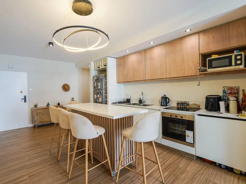 La cocina integrada se destaca por sus muebles de primera línea, alacenas y bajo mesada de excelente calidad, con un diseño funcional y moderno que se integra perfectamente al ambiente principal.