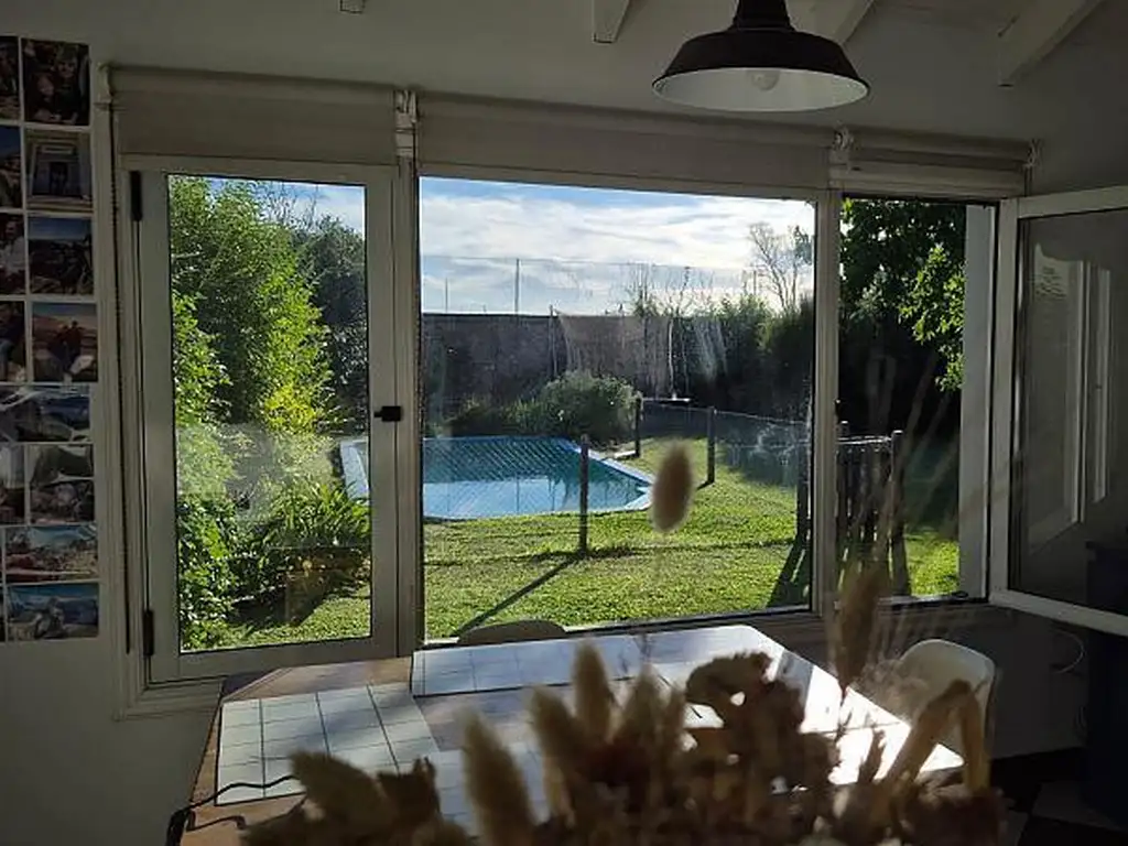 El exterior de la casa cuenta con una galería, pileta, jardín y una parrilla portátil. La entrada de autos tiene capacidad para tres vehículos, uno de los cuales bajo techo de PVC acanalado.