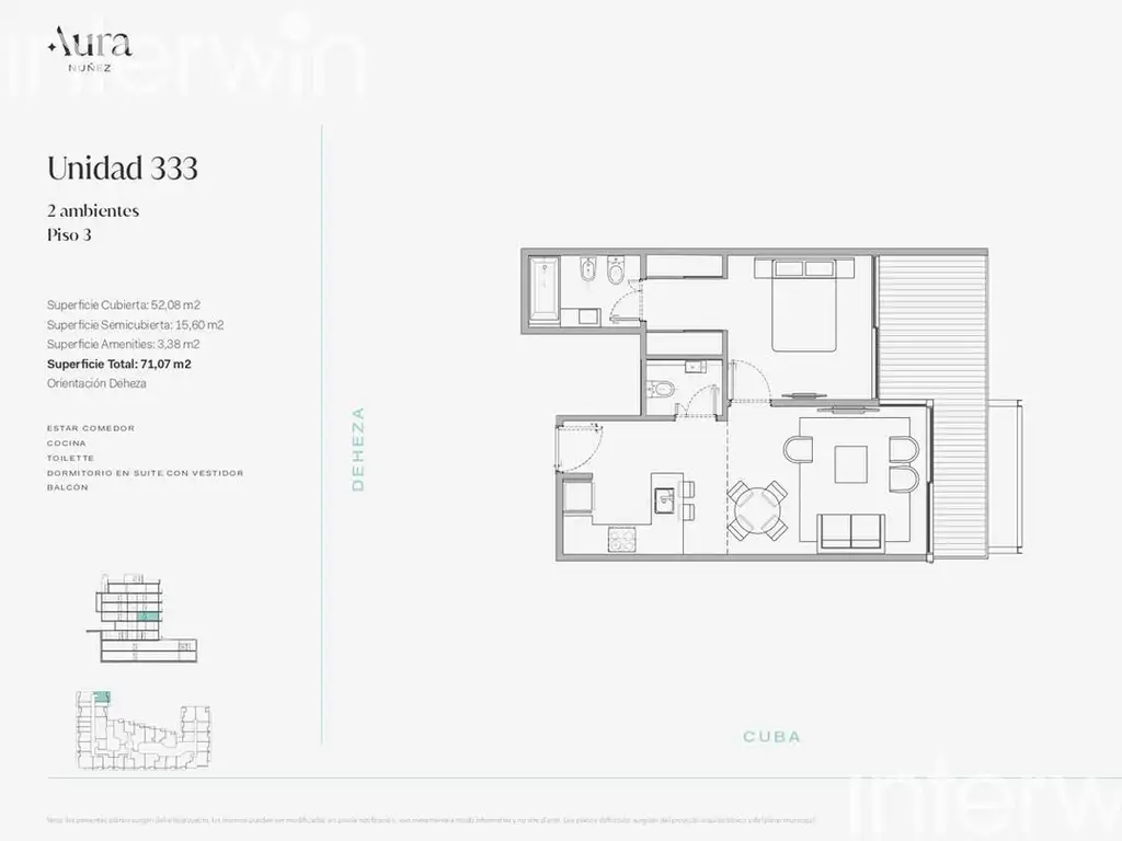 Todas las imágenes, planos, descripciones, y características indicadas son meramente referenciales e ilustrativas y podrán ser modificadas sin previo aviso. Las superficies indicadas son estimadas. Las superficies y medidas definitivas surgirán del plano de mensura final aprobado oportunamente por el GCBA. Las fechas de inicio de obra o posesión son estimadas, podrán ser reprogramadas por la Dirección de obra y dependerán a su vez de un proceso de aprobaciones municipales u otros organismos intervinientes. Los precios indicados podrán modificarse sin previo aviso. El interesado deberá realizar las verificaciones respectivas previamente a la realización de cualquier operación, requiriendo por sí o sus profesionales las copias necesarias de la documentación que corresponda.