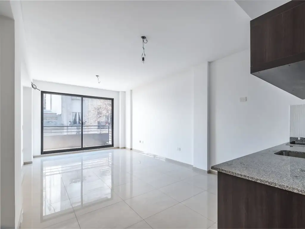 En su ingreso baño con bañera y artefactos ferrum , cocina con mesada de marmol, ambiente amplio con vista al balcon y pisos de porcellanato, instalacion de aire acondicionado , balcon super amplio (3,70 mts) (indispensable)