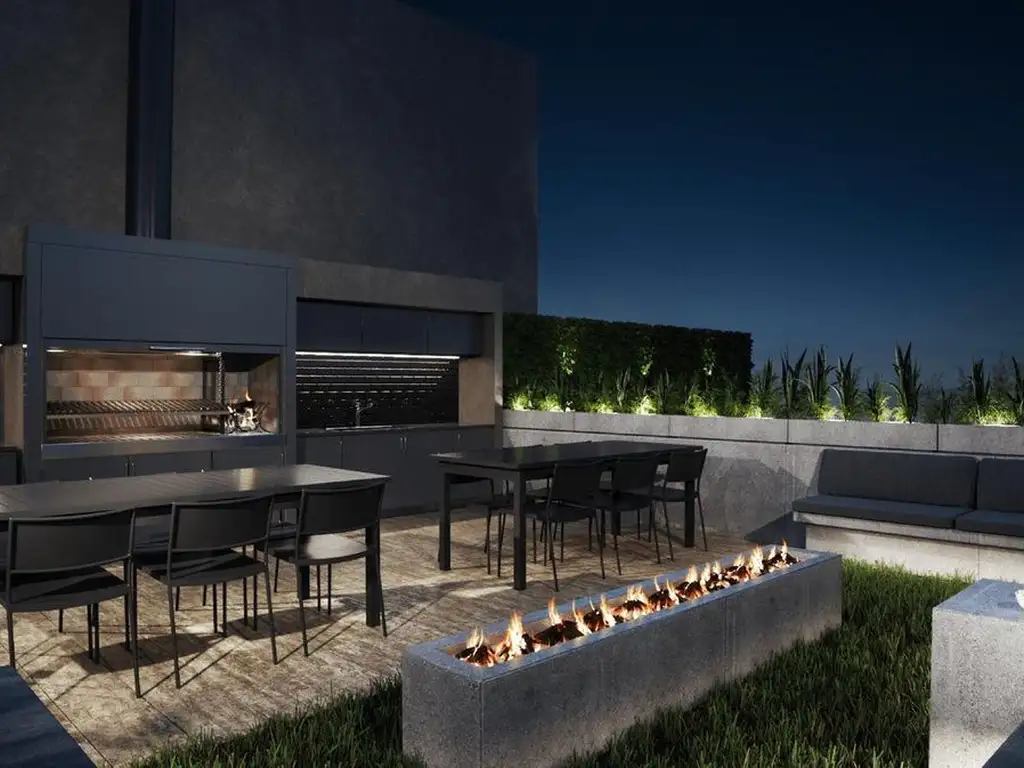 En la terraza se encuentra el área de amenities, a la que se puede acceder tanto por ascensor como por escalera: pileta, solarium, terraza verde, SUM abierto y parrilla. Además, cuenta con cabanas privadas, de uso exclusivo de sus propietarios.