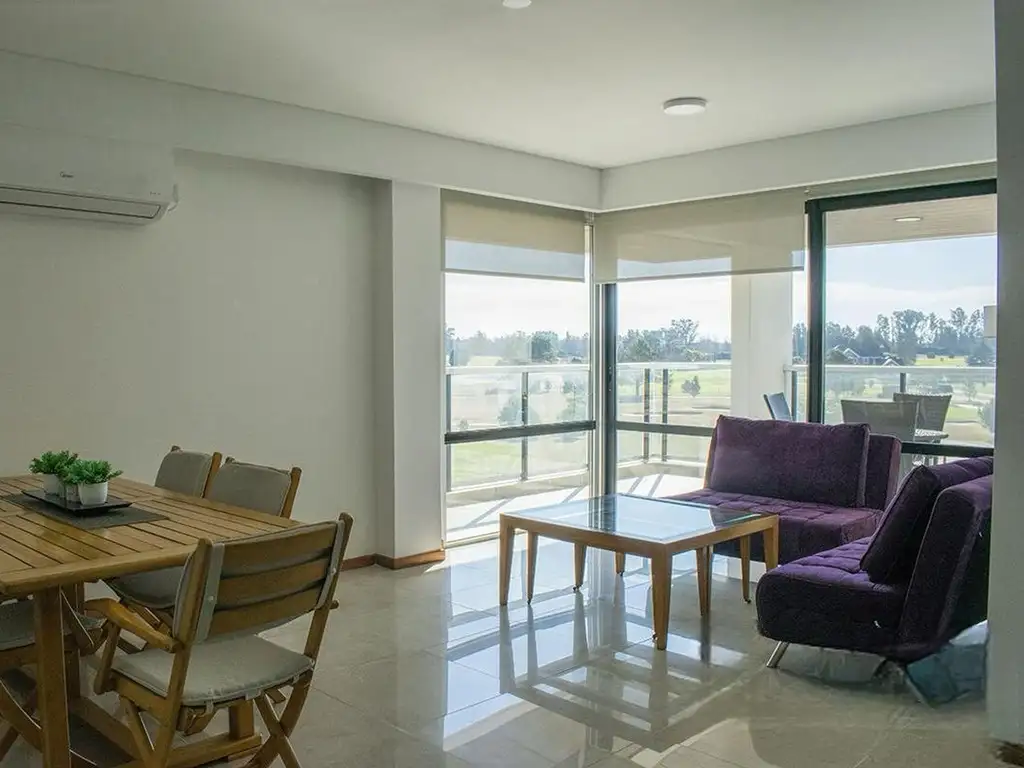 Comodidades: living-comedor amplio con excelente vista al golf. Cocina muy bien equipada integrada con barra. Toilette de recepción. Dormitorio en suite con placard, aire frio calor y baño completo. 1 cochera.