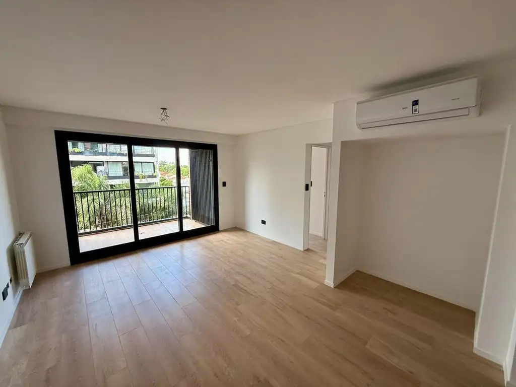 La unidad cuenta con cocina equipada con muebles bajo mesada y alacenas, y espacio para comedor diario. A continuación, un amplio living-comedor integrado, con salida al balcón que aporta gran luminosidad.