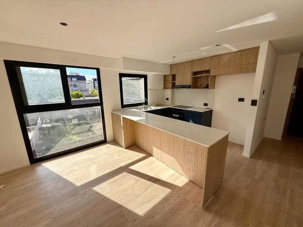 La unidad cuenta con cocina equipada con muebles bajo mesada y alacenas, y espacio para comedor diario. A continuación, un amplio living-comedor integrado, con salida al balcón que aporta gran luminosidad.