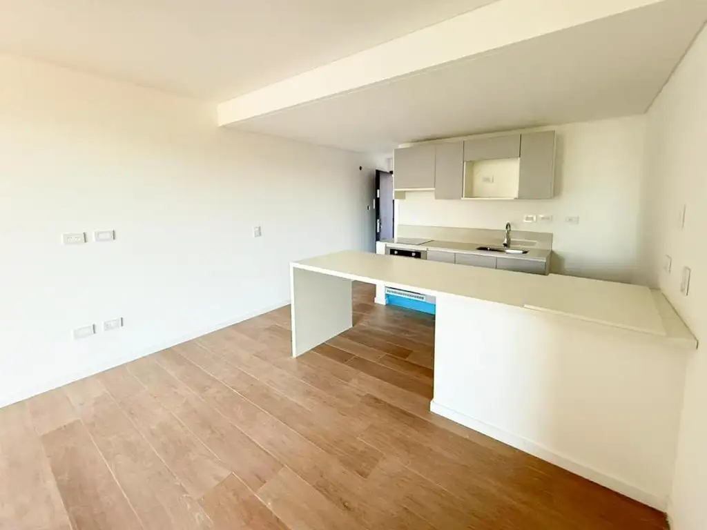 Departamento: Al ingresar, se encuentra la cocina lineal integrada, cuyo límite lo marca una barra desayunadora en "L" que funciona como comedor y zona de trabajo. El centro de la planta queda liberado como área social, conectada directamente a un balcón privado mediante un gran ventanal que garantiza luminosidad.
