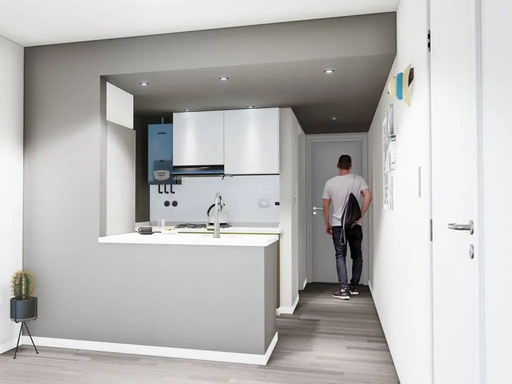 Departamento de un dormitorio de 43,3 mts. La cocina se encuentra semintegrada al living por una barra.