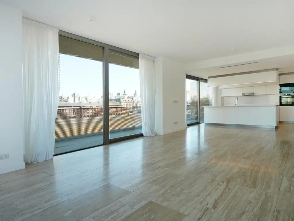 Esta unidad cuenta con living comedor, con cocina e isla. Cocina equipada con heladera y lavavajillas panelables, espacio para lavarropas. Microondas y horno empotrables marca Miele. Grandes ventanales que conectan al balcón central garantizando una conexión entre el espacio interior y el agua.