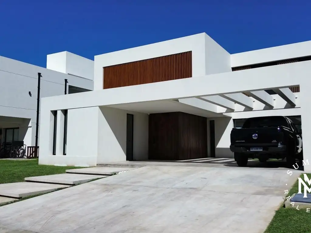 Planta alta: master suite con doble vestidor, baño con antebaño y doble bacha, balcón privado; dormitorio en suite con balcón; tercer dormitorio con placard; estar íntimo o sala de juegos y baño completo.