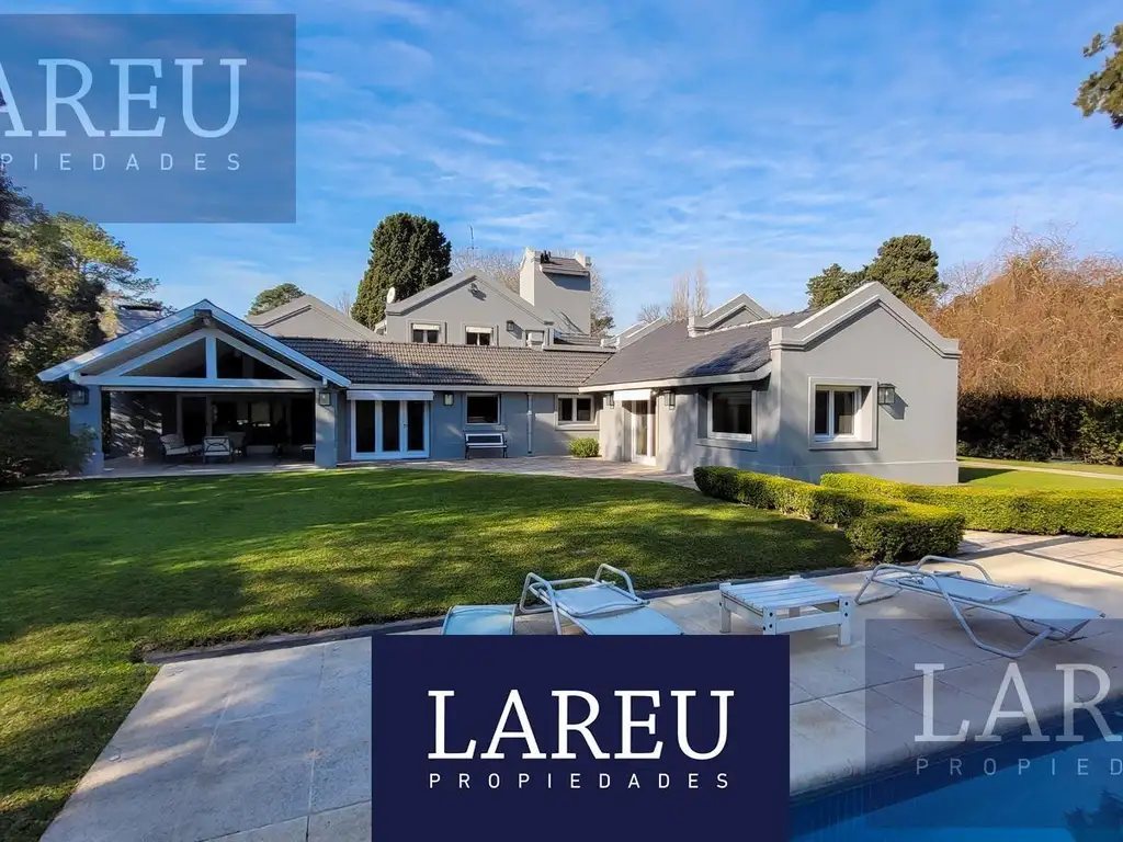En el exterior, la propiedad ofrece un quincho cubierto con parrilla, baño de piscina, cuarto de herramientas y dependencia. La cochera es totalmente cubierta, con portón eléctrico y capacidad para dos autos. Se suma una gran piscina rodeada de parque.