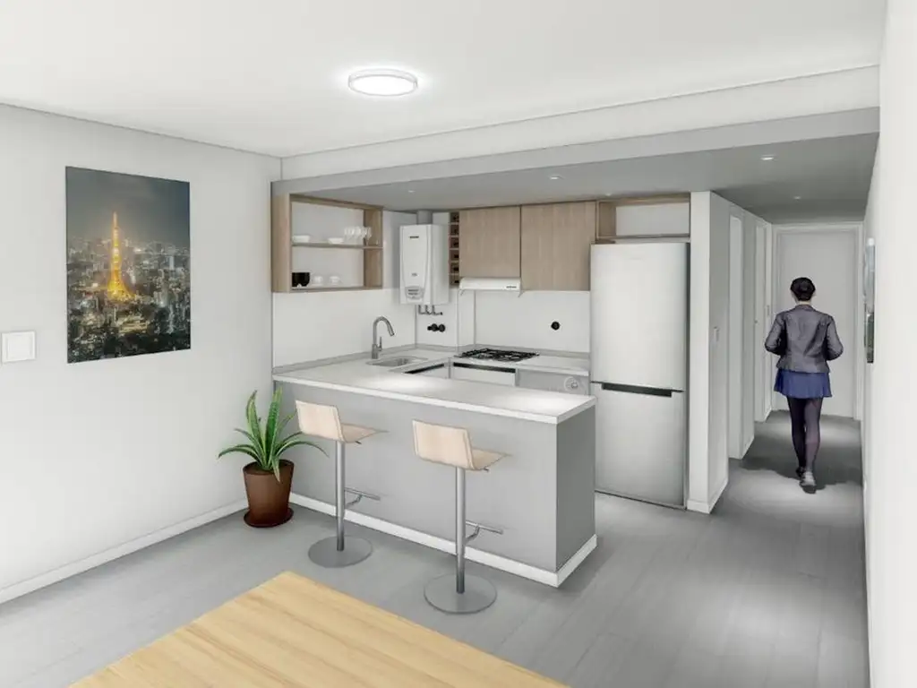 Departamento de dos dormitorio de 76,75 mts. La cocina se encuentra semintegrada al living por una barra.