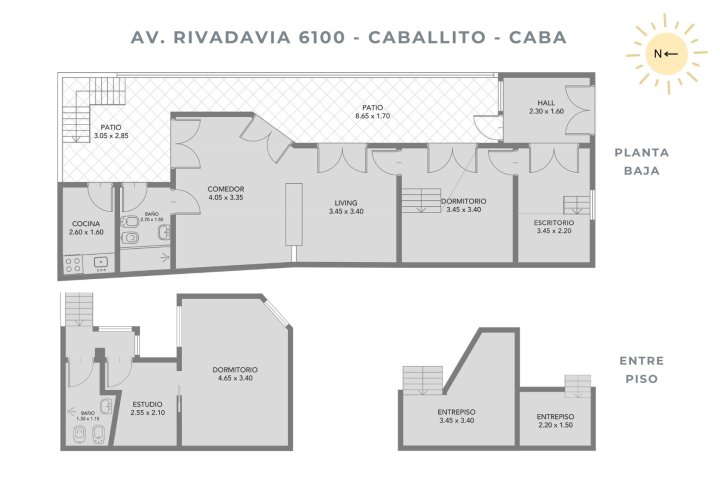 Hall de recepción. Acceso a oficina o 1º dormitorio con entrepiso. Patio cubierto (originalmente descubierto) con paneles de apertura para ventilación. Dormitorio principal con entrepiso. Living de doble altura conectado a comedor con entrepiso. Baño completo. Cocina independiente. Lavadero en patio. En 1er piso: 3er dormitorio, estudio y baño. Estufa TB y 2 aires F/C. Apto profesional. Ubicado en Caballito, cerca de subte A (Carabobo) y Av. Pedro Goyena.