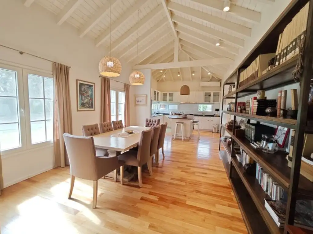 Desde el ingreso se destaca un imponente living con techos altos de madera a la vista, que aporta una sensación de amplitud y carácter. El hogar a leña, junto a las grandes aberturas, genera un ambiente cálido, luminoso y con fuerte conexión con el exterior.