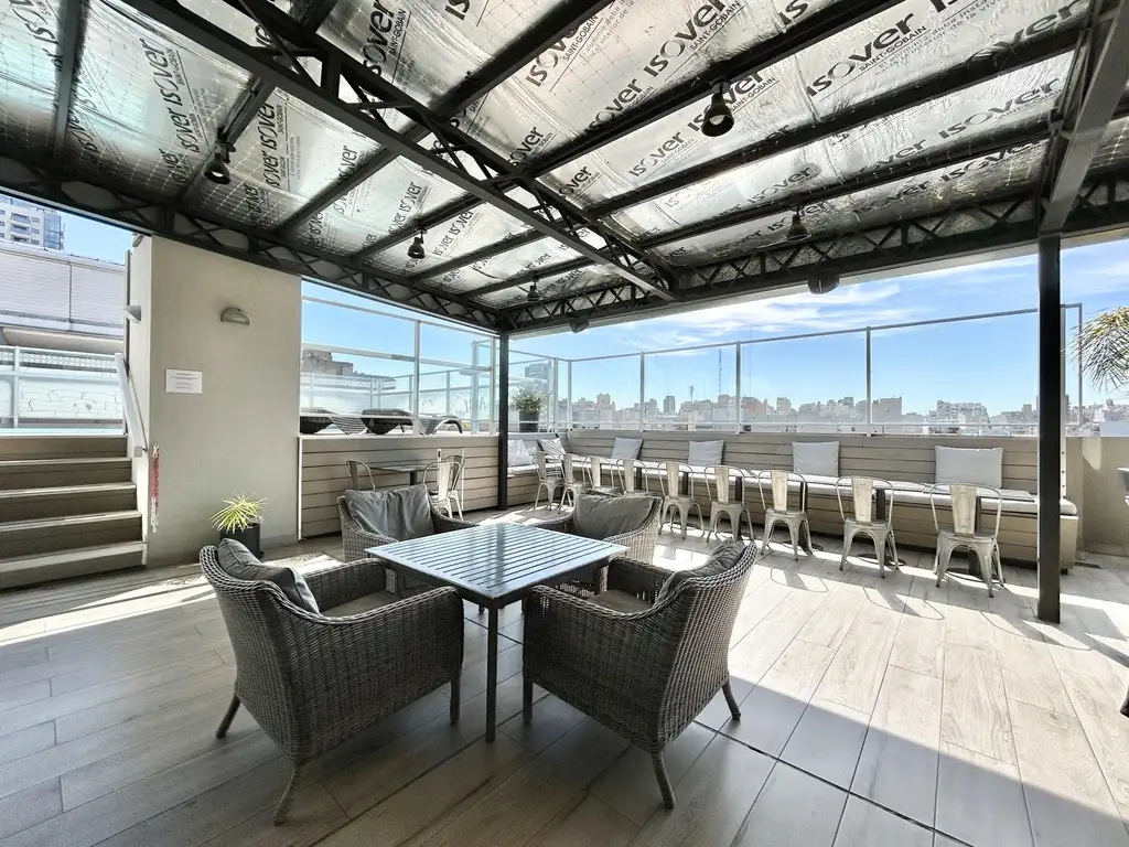 La unidad cuenta con un ambiente amplio y luminoso, con placard de puertas espejadas, mesa con sillas y salida a un balcón corrido al frente que aporta luz natural durante todo el día. Baño completo con terminaciones de calidad. Cocina americana totalmente equipada, ideal para quienes buscan funcionalidad y diseño. Incluye aire acondicionado ya instalado y pisos de porcelanato, que aportan un toque moderno y elegante.