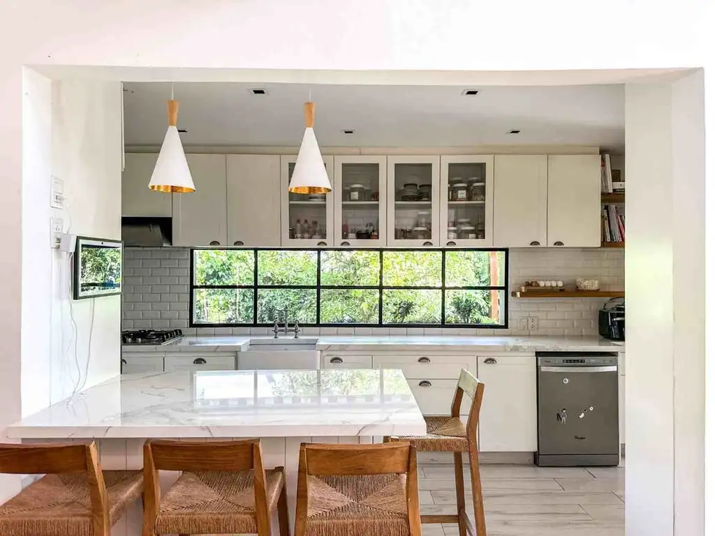 El living comedor súper luminoso con ventanales de paño fijo y una chimenea. La cocina totalmente nueva, moderna, con vidrio repartido donde permite el ingreso de luz, con un lavadero separado con una puerta de vidrio repartido, con espacio para lavarropas, secarropas y freezer. Desde la cocina se accede a la galería, y al sector parrilla y horno de barro, acompañando la vista del jardín y la pileta en excelente estado.