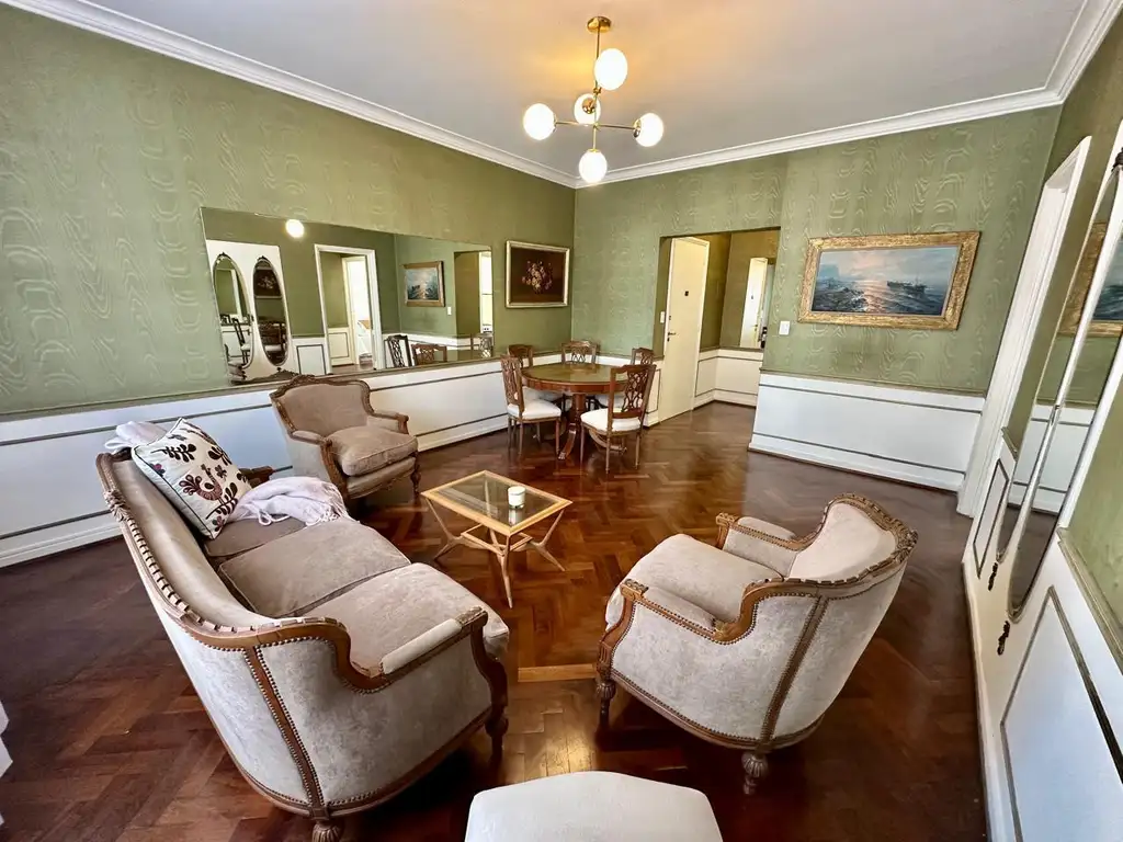 Al ingresar te recibe un cómodo hall de recepción que da paso a un living comedor de generosas dimensiones. El ambiente se destaca por su impronta clásica, con muebles de estilo francés y empapelado original en excelente estado, aportando carácter y calidez.