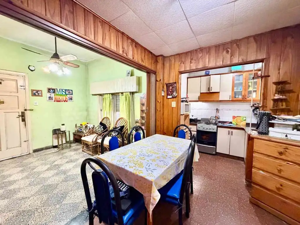 El inmueble, construido en 1976, presenta un estado general bueno con distribución funcional que incluye living-comedor, dos habitaciones y baño completo. La cocina cuenta con muebles bajo mesada y alacenas, mesada de mármol y pisos cerámicos. Las habitaciones exhiben pisos de madera, mientras el baño mantiene artefactos y grifería en condiciones óptimas.