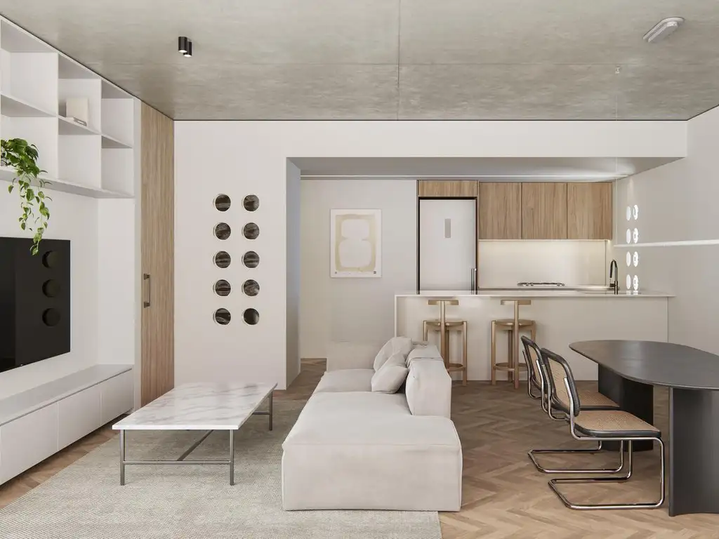 Pisos prefinished de madera en estar y dormitorio, cielorrasos de hormigón visto, ventanales de piso a techo, cocina integrada con isla, anafe eléctrico, horno eléctrico, mesadas de purastone o similar, griferia FV o similar, baño con vanitory, sanitarios ferrum o similar, griferia fv o similar, piso técnico de baldosas en balcones, preinstalación para aire acondicionado frio calor en todos los ambientes, agua caliente central por caldera. Frente del edificio en Hormigón visto con barandas de vidrio laminado.