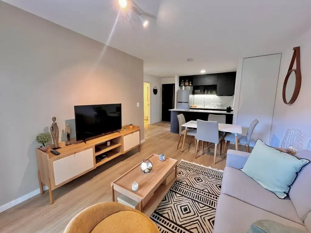 El espacio se distribuye de manera optimizada, con una zona de descanso y un living que se integra a una terraza y patio privado. La cocina, de excelente calidad, cuenta con muebles aéreos y bajo mesada, y el baño completo presenta terminaciones modernas. Los amplios ventanales aseguran luz natural y buena ventilación.